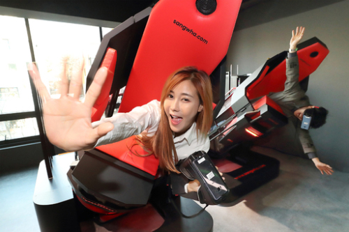 20일 서울 서대문구의 VR방인 ‘브라이트’에서 모델들이 ‘플라잉 젯’ 놀이기구를 직접 체험하고 있다. KT 제공 |