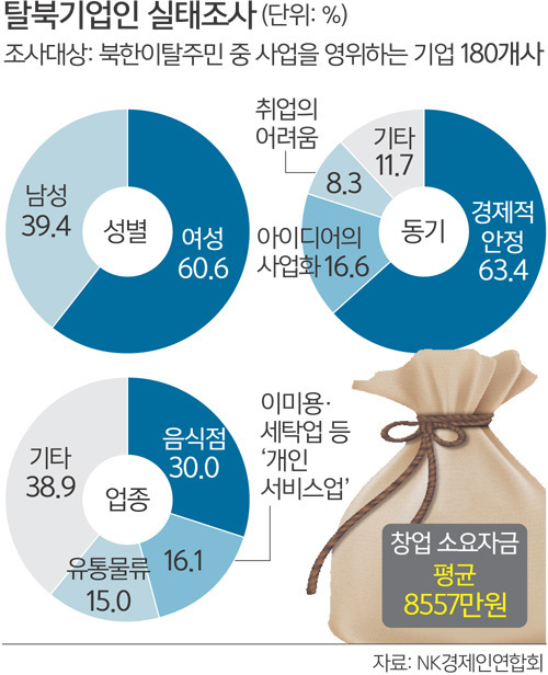 국내 북한이탈주민은 3만1000명 정도로 추산되고, 이 중 57.9%가 경제활동에 참여하는 것으로 중기벤처부는 추산했다. 그런데 대부분 취업을 통해 생활하고 창업자 수는 미미한 것으로 분석됐다. 중기벤처부에 따르면 창업에 뛰어든 북한이탈주민은 7% 수준인 약 2200명으로 추정된다.