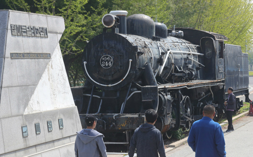 | 역사적인 2018 남북 정상회담의 감동이 채 가시지 않은 28일 오전 경기 파주시 임진각을 찾은 관광객들이 철도중단점 열차를 바라보고 있다. 문재인 대통령과 김정은 북한 국무위원장은 4.27 판문점 선언을 통해 완전한 한반도 비핵화와 동해선, 경의선 철도 연결 등을 합의했다. |