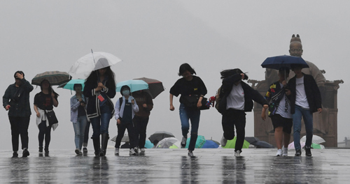 | 전국적으로 비가 내린 16일 우산을 쓴 시민들이 서울 광화문광장을 지나고 있다. 이날 수도권을 중심으로 벼락과 돌풍을 동반한 폭우가 쏟아지면서 곳곳에서 나무가 쓰러지거나 물이 새는 등 사고가 발생했다. 허정호 선임기자 |