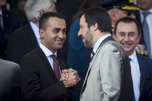 | 새롭게 출범한 이탈리아 정부에서 각각 부총리 겸 내무장관과 부총리 겸 노동산업부 장관으로 입각한 마테오 살비니 동맹 대표(오른쪽)와 루이지 디 마이오 오성운동 대표가 2일(현지시간) 로마에서 열린 공화국 선포 기념일 기념식에서 두 손을 맞잡고 있다. 로마=EPA연합뉴스 |