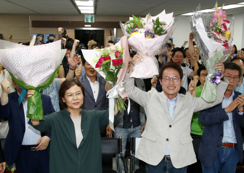 조희연 서울시교육감 당선자가 13일 밤 서울 서대문구 자신의 선거사무소에서 부인 김의숙씨와 함께 꽃다발을 들고 기뻐하고 있다. 뉴시스 |