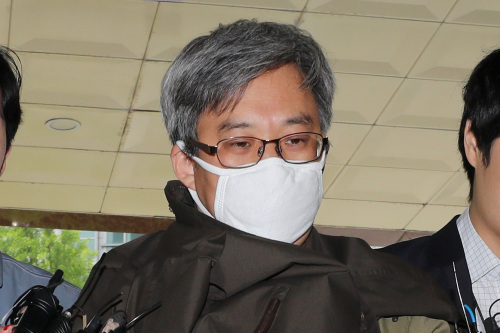 ‘드루킹’ 김동원씨가 지난 11일 오전 서울 종로구 서울지방경찰청에서 댓글조작 관련 혐의에 대한 조사를 받기 위해 사이버범죄수사대로 압송되고 있다. 뉴스1