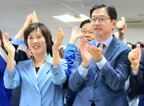 더불어민주당 김경수 경남도지사 당선인(앞줄 오른쪽)이 14일 경남 창원 성산구 선거사무실에서 6.13 지방선거 당선이 확실시 되자 부인 김정순 씨와 함께 꽃다발을 들고 기뻐하고 있다. 뉴스1