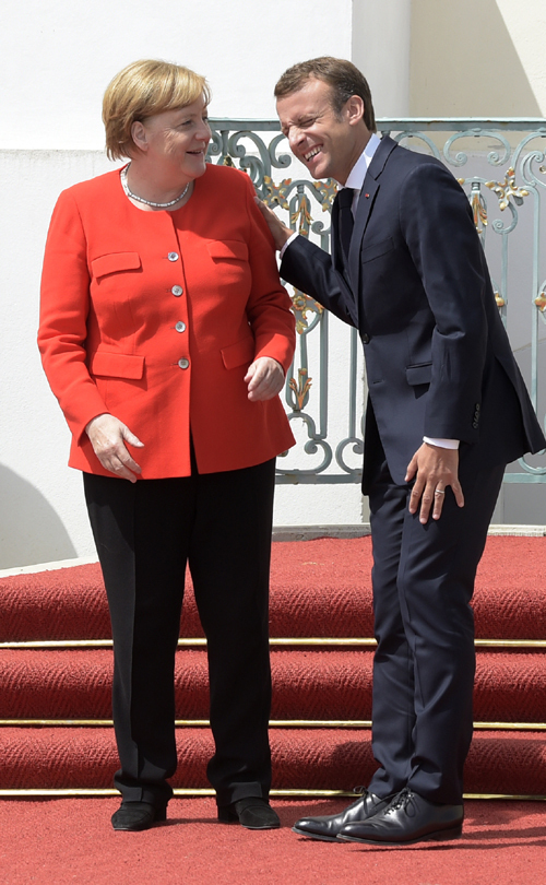 | 에마뉘엘 마크롱 프랑스 대통령(오른쪽)이 19일(현지시간) 독일 베를린 인근 메제베르크 영빈관에 도착해 앙겔라 메르켈 독일 총리의 영접을 받으며 활짝 웃고 있다. 메제베르크=AP연합뉴스 |