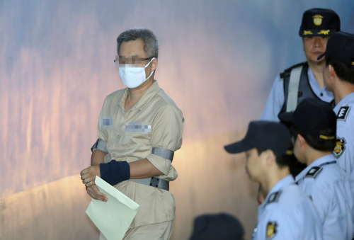 네이버 댓글 여론조작 혐의를 받는 파워블로거 ''드루킹'' 김모 씨가 20일 오전 서울 서초구 서울중앙지법에서 열린 속행공판에 출석하며 법정으로 향하고 있다. 연합뉴스