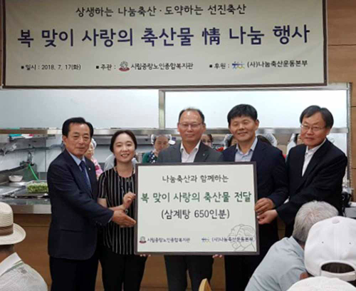 | 나눔축산운동본부는 복날을 맞이하여 17일 서울시립중랑노인종합복지관(서울 중랑구)을 찾아 소외계층 어르신들을 위해 삼계탕 650인분을 전달하였다. 김태환 축산경제대표이사가 어르신들게 삼계탕을 배식하고 있다. |
