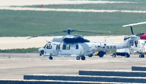 활주로에 발 묶인 마린온 18일 오후 경북 포항시 남구 해군 6항공전단 활주로에 해병대 1사단 소속 마린온 상륙기동헬기들이 계류해 있다. |