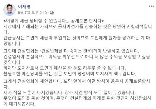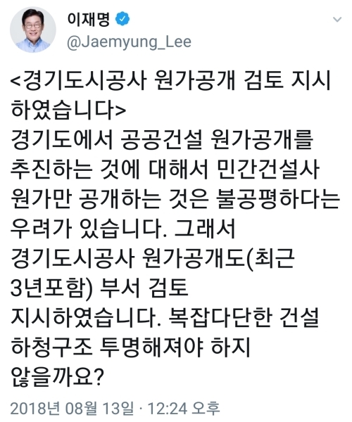 이 지사는 이날 “경기도에서 공공건설 원가공개를 추진하는 것에 대해 민간건설사 원가만 공개하는 것은 불공평하다는 우려가 있습니다”라며 이같이 적었다. 이어 “복잡다단한 건설 하청구조, 투명해져야하지 않을까요?”라고 반문하며 지난 9일 밝힌 “‘건설적폐’와의 전쟁”을 지속할 것을 공언했다.