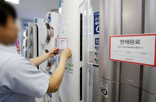서울의 한 전자제품 판매점에서 직원이 판매완료된 에어컨에 안내문을 붙이고 있다. 자료사진 |