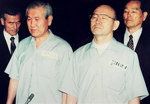 | 12·12 및 5·18 사건으로 구속기소된 전두환·노태우 두 전직 대통령이 1996년 첫 재판 당시 수의 차림으로 법정에 나란히 서있다. 세계일보 자료사진 |