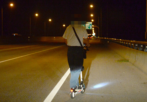 지난 17일 오전 5시쯤 서울~양양고속도로 요금소 인근에서 전동킥보드를 탄 한 시민이 헬멧 등 안전 보호 장구를 착용하지 않은 채 고속도로 진입 구간을 달리고 있다. 차량들이 과속을 일삼는 구간이기 때문에 운전자들이 급정거를 하는 등 대형사고 위험이 도사리고 있다.