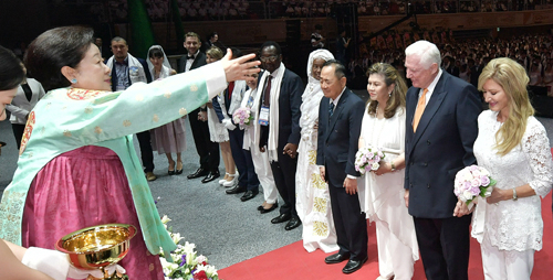 성화축제 중간에 큰 박수를 받으며 등단한 한 총재는 무대 상단에 마련된 문 총재 존영에 헌화하고 이어 진행된 축복식을 주관했다. 신랑 신부는 장내에 울려 퍼진 문 총재의 육성을 통해 하나님 아래 인류 대가족 실현이라는 국제축복결혼식 의미를 되새겼다. 이어진 2부 행사는 화려한 축제의 장으로 펼쳐졌다.