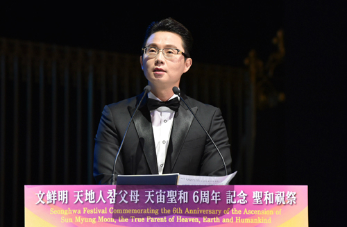 | 27일 오전 경기 가평군 청심평화월드센터에서 열린 ‘문선명 천지인참부모 천주성화 6주년 기념 성화축제’에서 정원주 총재비서실장이 ‘그리움의 서신’을 낭독하고 있다. 가평=하상윤 기자 |