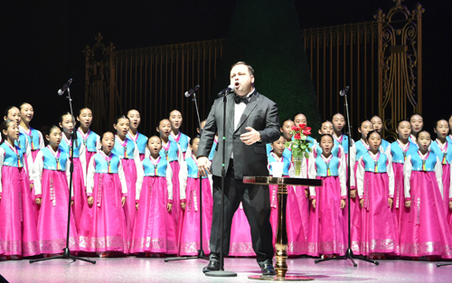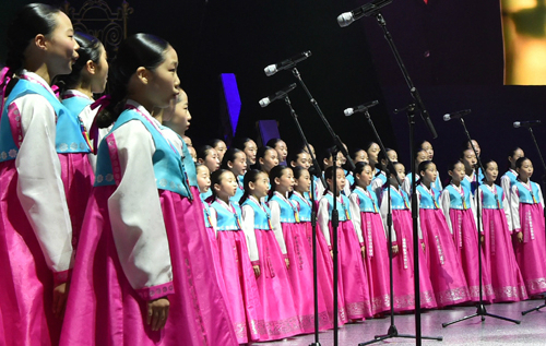 | 27일 경기도 가평군 청심평화월드센터에서 열린 "세계평화통일가정연합 문선명 총재 천주성화 6주년 기념 2018 천지인 참부모 효정 천주축복식"에서 폴포츠와 리틀엔젤스단원들이 축하공연을 하고 있다. 가평=이제원기자 |