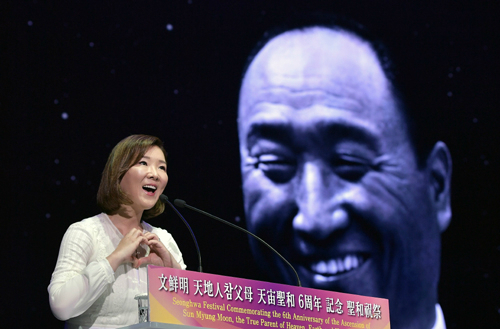 | 27일 오전 경기 가평군 청심평화월드센터에서 열린 ‘문선명 천지인참부모 천주성화 6주년 기념 성화축제’에서 문선진 세계회장이 성화사를 하고 있다. 가평=하상윤 기자 |