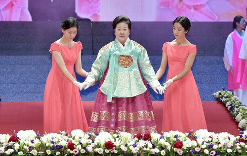 | 27일 오전 경기 가평군 청심평화월드센터에서 열린 ‘문선명 천지인참부모 효정 천주축복식’에서 한학자 총재가 입장하고 있다. 가평=하상윤 기자 |