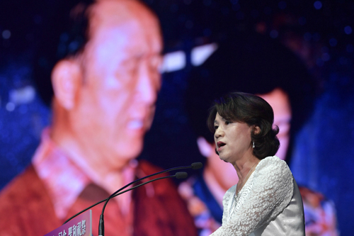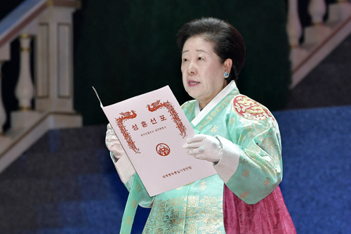 | 27일 오전 경기 가평군 청심평화월드센터에서 열린 ‘문선명 천지인참부모 효정 천주축복식’에서 한학자 총재가 성혼선포를 하고 있다. 가평=하상윤 기자 |
