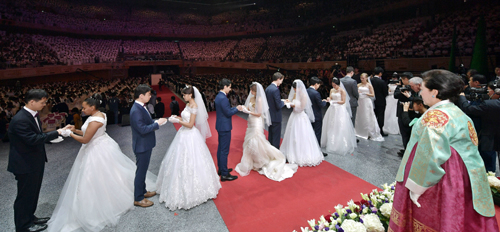 | 27일 오전 경기 가평군 청심평화월드센터에서 열린 ‘문선명 천지인참부모 효정 천주축복식’에서 신랑 신부들이 예믈을 교환하고 있다. 가평=하상윤 기자 |