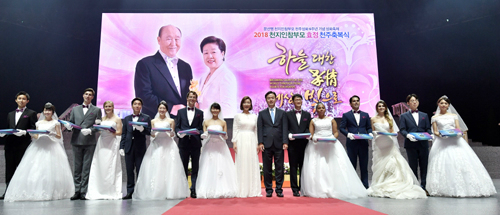 문선명 총재 성화 6주년·천주축복식 / 국내외 각계 지도자 등 3만명 참석 / 190개국 28만쌍 합동결혼식 거행 세계평화통일가정연합(한국회장 이기성)은 27일(음력 7월 17일) 경기도 가평군 청심평화월드센터에서 ‘문선명 천지인참부모 천주성화 6주년 기념 성화축제’(추모식) 및 ‘2018 천지인참부모 효정 천주축복식(국제합동결혼식)’을 거행했다. ‘인류 한 가족’의 비전과 효정(孝情) 정신의 의미를 되새기는 자리였다. 이날 행사장에는 한국을 비롯한 20여 개국에서 온 신랑 신부 4000여 쌍이 참석했고, 세계 190여 개국 신랑 신부 28만쌍이 인터넷 생중계로 연결되어 동시 결혼식을 올렸다. 아울러 국내외에서 참석한 각계 지도자들을 비롯한 가정연합 회원 3만여 명이 신랑 신부의 성혼을 축하했다.