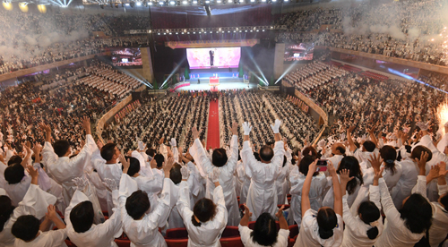 | 27일 경기도 가평군 청심평화월드센터에서 열린 "세계평화통일가정연합 문선명 총재 천주성화 6주년 기념 2018 천지인 참부모 효정 천주축복식"에서 한학자 총재와 참석자들이 억만세삼창을 하고 있다. 가평=이제원기자 |
