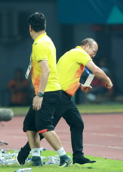 | 27일 밤 시리아와의 2018아시안게임 남자축구 8강전서 연장접전끝에 1-0으로 승리한 뒤 박항서 베트남 대표팀 감독이 한 손으로는 베트남 응원단에게 손을 들어 감사의 인사를, 한 손으로는 120분을 뛴 선수 들을 격려하고 있다. 브카시=연합뉴스 |