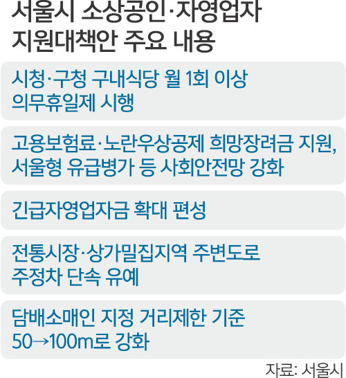 시는 우선 시와 25개 자치구, 투자기관 5곳(서울교통공사, 서울시설공단, 서울시농수산식품공사, 서울주택도시공사, 서울에너지공사), 산하기관 6곳(상수도사업본부, 한성백제박물관, 북부수도사업소, 보건환경연구원, 체육시설관리사업소, 서부도로사업소)을 대상으로 구내식당 의무휴일제를 도입, 청사 주변 요식업자들을 돕는다.