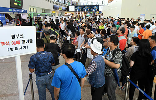 | KTX 등의 추석 열차 예매가 시작된 지난달 28일 귀성표를 구하기 위해 서울역을 찾은 시민들이 줄을 서 순서를 기다리고 있다. 서상배 선임기자 |