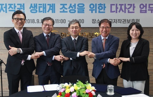 | 한국문화정보원 이현웅 원장, 게임물관리위원회 이재홍 위원장, 한국저작권보호원 윤태용 원장, 한국언론진흥재단 민병욱 이사장, 한국데이터진흥원 민기영 원장(왼쪽부터)이 5개 기관의 상호협력에 관한 다자간 업무협약(MOU)을 체결한 뒤 기념촬영을 하고 있다. 한국저작권보호원 제공 |