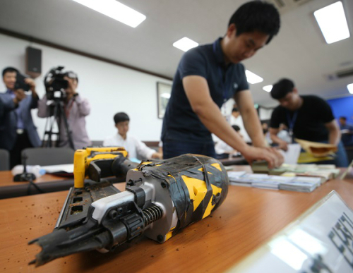 | 10일 오전 충남 당진시 송악농협을 턴 A(52)씨가 범행에 사용한 타정기가 당진경찰서 소회의실에 놓여있다. 연합뉴스. |