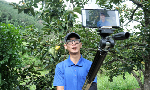 | 지난 11일 경북 청도군 매전면의 한 감나무 앞에서 유튜브 ‘청도달콤한농장’ 채널을 운영하는 박광묵(36)씨가 동영상을 촬영하고 있다. 청도=이창훈 기자 |