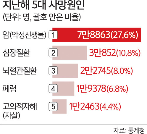 사망 원인별로 보면 암으로 인한 사망이 가장 많았다. 지난해 암 사망자는 통계 작성 후 최다인 7만8863명으로, 전체의 27.6를 차지했다.