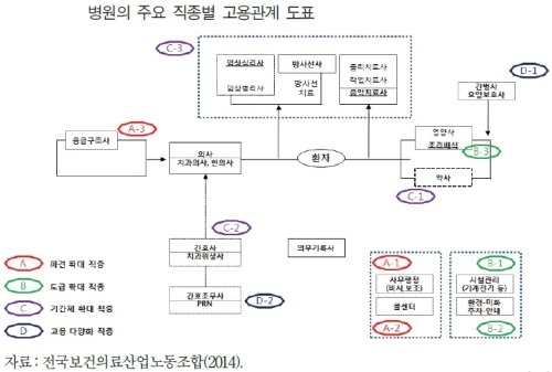 병원의 업무의 가장 큰 특징은 노동집약적이라는 부분이다. 이를 통해 환자의 건강과 생명을 다루기 때문에 전문성뿐 아니라 협업의 중요성이 매우 크다. 고용형태가 다양해질수록 근로자 간 정보 비대칭성이 증가해 팀워크를 저해하는 것이다.