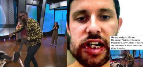 이를 들은 와일더는 글러브를 끼치도 않은 채 풀스윙을 날렸고, 마스코트 안에 있던 사람은 맞은 즉시 쓰러졌다. 프로복서 강펀치를 온전히 맞은 남성은 치아가 부러지고 턱이 골절되는 중상을 입었다.