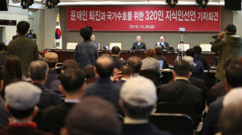 | 26일 서울 프레스센터에서 열린 '문재인 퇴진과 국가수호를 위한 320인 지식인 선언' 기자회견 모습 |