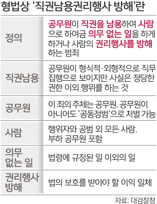 직권남용죄는 공무원이 직권을 남용해 다른 사람이 의무 없는 일을 하게 하거나, 그 사람의 정당한 권리행사를 방해할 때 물을 수 있다. 공무원이 아닌 공범한테도 적용이 가능하다.