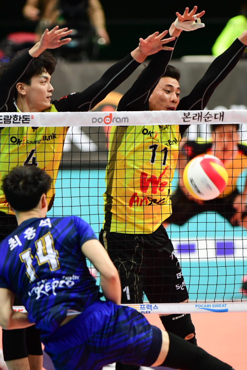 | 24일 안산 상록수체육관에서 열린 V-리그 남자부 경기에서 한국전력 최홍석(왼쪽)의 스파이크가 OK저축은행의 블로킹에 가로막히고 있다. 한국배구연맹 제공 |