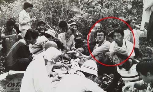 | 지난 10일부터 옛 상무대 영창 부지인 광주 서구 5·18 자유공원에서 열리는 ‘5·18 영창 특별전-스물세 개의 방 이야기’ 전시회에서 김사복씨(붉은 원 오른쪽)가 위르겐 힌츠페터와 함께 1975년 10월 경기 포천에서 의문사한 장준하 선생의 추락사 현장에서 찍힌 사진이 전시되고 있다. 연합뉴스 |