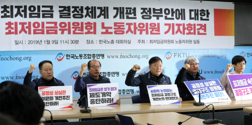 최저임금위원회 근로자위원들은 9일 기자회견을 열고 “정부가 경제민주화 공약 등 대부분의 공약이 사실상 실패하자 모든 책임을 힘없는 근로자와 최저임금 탓으로 돌리고 있다”며 “일방적인 최저임금법 개악 논의를 중단하라”고 주장했다. 민주노총과 한국노총, 청년유니온 등에 소속된 근로자위원들은 “최저임금 결정구조의 이원화는 과거 제도개선 태스크포스(TF)에서 사용자위원들이 제시했지만 근로자위원들이 반대했던 내용으로 제대로 된 논의는 없었다”고 말했다.