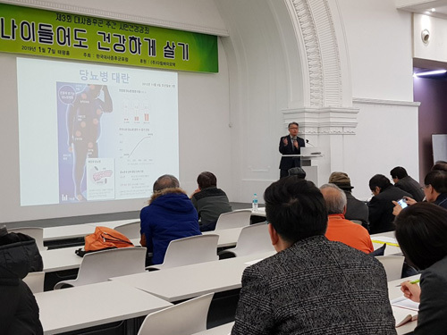 | 지난 7일 한국대사증후군포럼 주최로 서울시민청에서 열린 새해 건강강좌에서 여의도성모병원 내분비내과 권혁상 교수가 당뇨질환과 관리법에 대해 설명하고 있다. 한국대사증후군포럼 제공 |