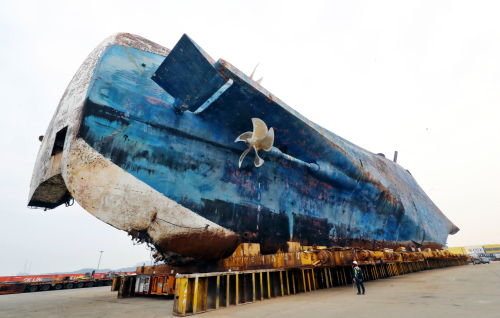 | 목포신항에 옆으로 누워 있는 세월호. 연합뉴스 |