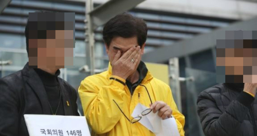 | 2017년 7월 서울 양재동 행정법원 앞에서 열린 세월호 희생자 기간제 교사의 순직 인정을 요구하는 기자회견에서 김초원씨의 아버지가 눈물을 흘리고 있는 모습. 연합뉴스 |