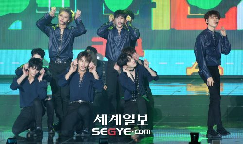 그룹 세븐틴이 23일 오후 서울 송파구 잠실동 잠실실내체육관에서 열린 '제8회 가온차트 뮤직어워즈'의 시상식에 참석해 열띤 공연을 펼치고 있다.