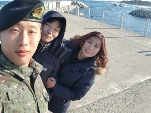 고(故)박용관(사진 왼쪽) 상병과 그의 부모님. 박용관 상병 가족 제공=연합뉴스
