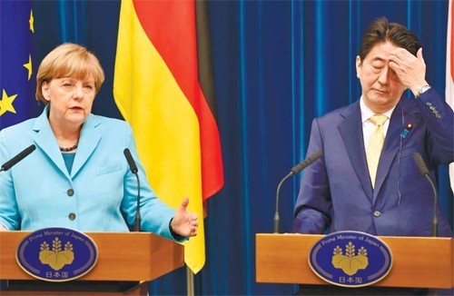 | 2015년 일본을 방문한 앙겔라 메르켈 독일 총리(왼쪽)가 도쿄 총리공관에서 아베 신조 일본 총리(오른쪽)와 정상회담을 한 뒤 공동기자회견을 열어 회담 내용을 설명하고 있다. 연합 자료사진 |