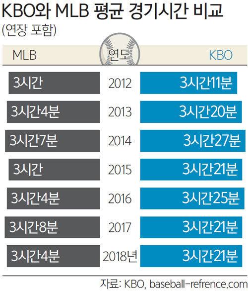 그렇다면 KBO리그는 어떨까. KBO도 1990년대 중반까지만 해도 평균 경기시간이 3시간을 밑돌았다. 하지만 타고투저가 심해진 최근에는 3시20분대까지 경기가 늘어지고 있다. 이미 MLB 못지않은 스피드 업 방안을 도입했음에도 허약한 투수가 막강한 타선을 막아내지 못하는 탓이다. 올해 공인구의 반발력을 줄이는 등 또 다른 변화를 꾀했지만 선수 저변이 더 넓어져야 제대로 ‘스피드 업’이 될 수 있다는 것이 많은 전문가들의 의견이다.