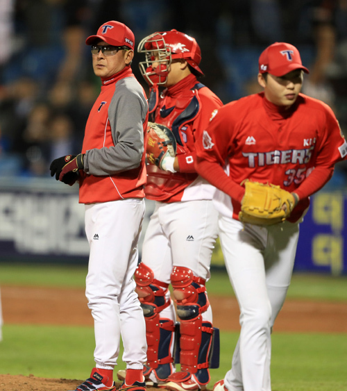 | 메이저리그가 경기시간 단축을 위해 투수교체 제한을 두는 규정 신설을 논의하고 있다. 지난해 KIA 김기태 감독(왼쪽)이 마운드에 올라 투수를 교체하는 장면. KIA 타이거즈 제공 |