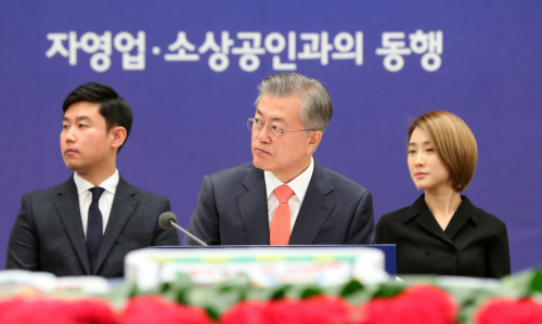 문 대통령은 이어진 오찬 간담회에선 “카드수수료 인하, 일자리안정자금 지원, 4대 보험료 지원, 상가 임대차 보호, 가맹점 관계 개선 등 조치들이 함께 취해지면 최저임금이 다소 인상돼도 자영업자들이 충분히 감당할 수 있을 텐데 최저임금이 먼저 인상되고 이런 보완조치들은 국회 입법사항이기 때문에 같은 속도로 이렇게 맞춰지지 않고 있다”고 말했다. 야당의 반대로 최저임금 인상에 따른 후속조치가 발 빠르게 진행되지 못한 데 대한 아쉬움을 토로한 것이다.