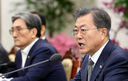 | 문재인 대통령이 18일 오후 청와대 여민관에서 열린 수석·보좌관 회의에서 발언하고 있다. 연합뉴스 |