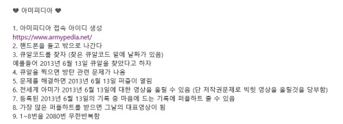 여기에 ‘아미피디아’에 대해 어려워 하는 팬들을 위해 참여할 수 있는 방법 등을 정리한 글이 인터넷 커뮤니티를 통해 빠르게 퍼져나갔다.